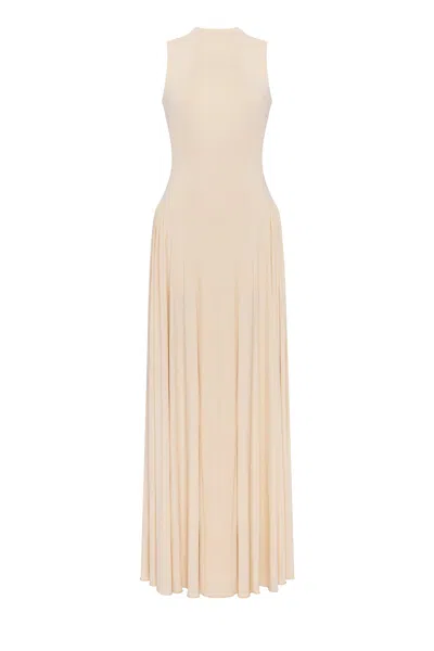 Nude Sleeveless Mock Neck Dress With A Pleated Maxi Skirt In Brown