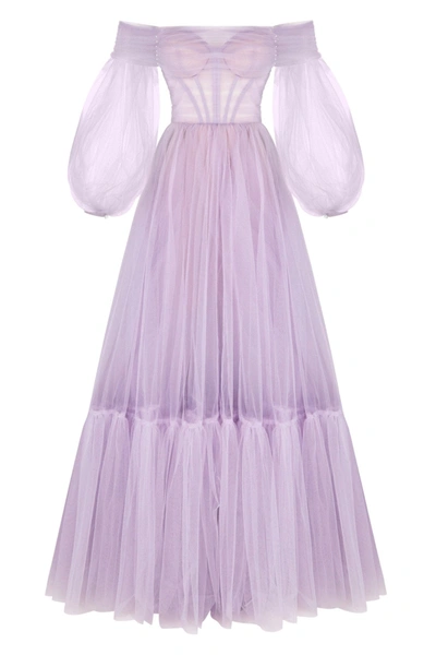 Lavender Sheer Sleeves Maxi Tulle Dress In Purple
