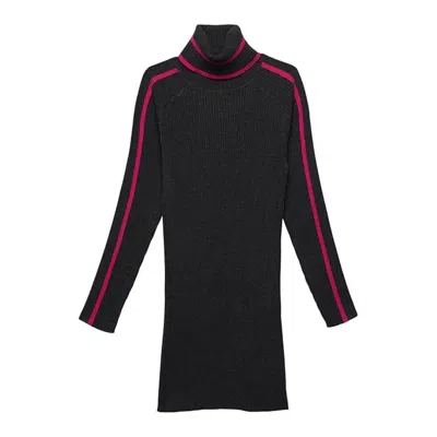 Women's Racer Dress Black Striped Ribbed Knit Turtleneck Red538