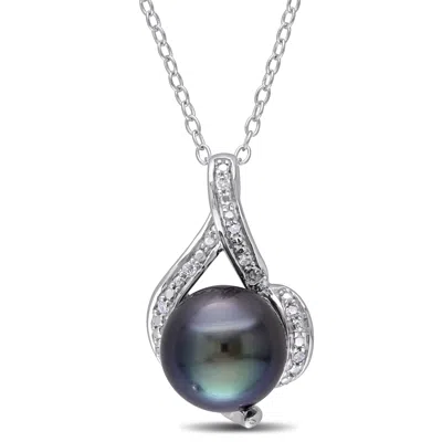 9-9.5mm Black Tahitian Pearl And Diamond Curlicue Necklace In Sterling Silver