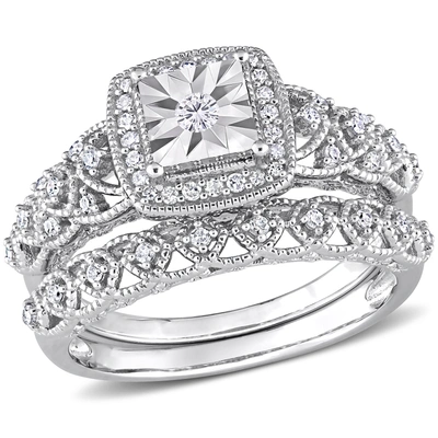 1/3ct Tdw Diamond Square Halo Bridal Ring Set In Sterling Silver