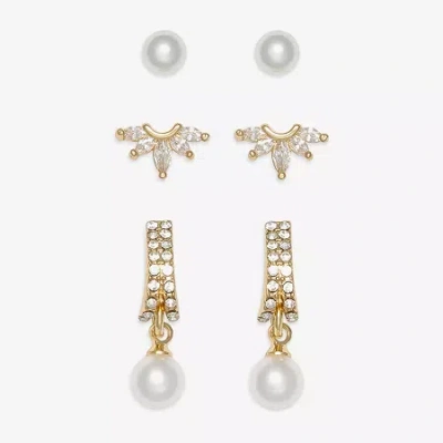 Womens Simulated Pearl Hypoallergenic 3 Pair Earring Set In Gold