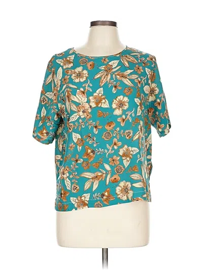 Pre-owned Short Sleeve Silk Top Teal Floral Pattern Square Neckline Tops In Blue