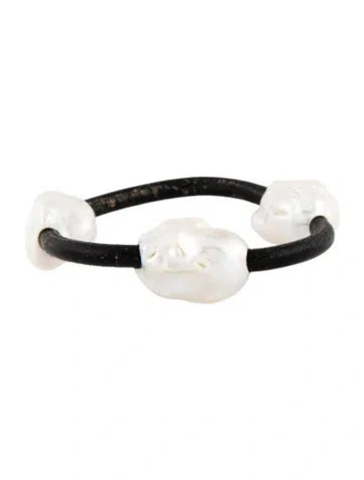 Pre-owned Baroque Pearl & Leather Cord Bangle Bracelet, 6" In Black