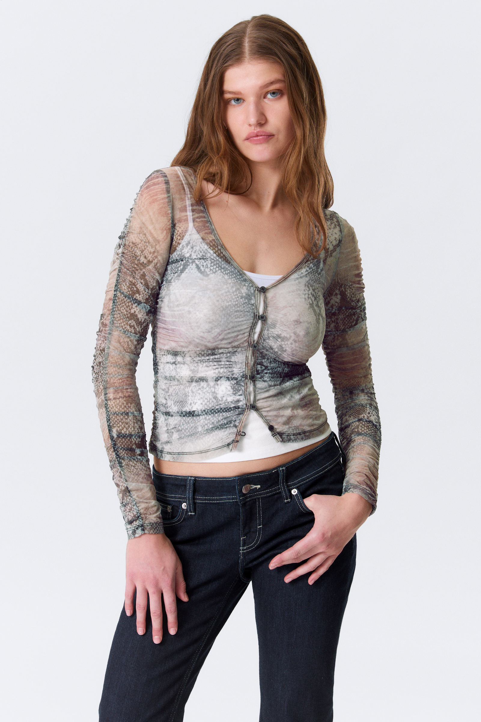 Fluted Sleeve Frill Trim Cardigan In Brown