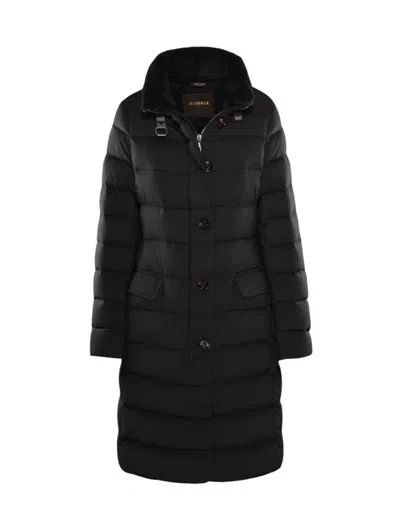Quilted Long Padded Coat With Plush Fur Hood In Black