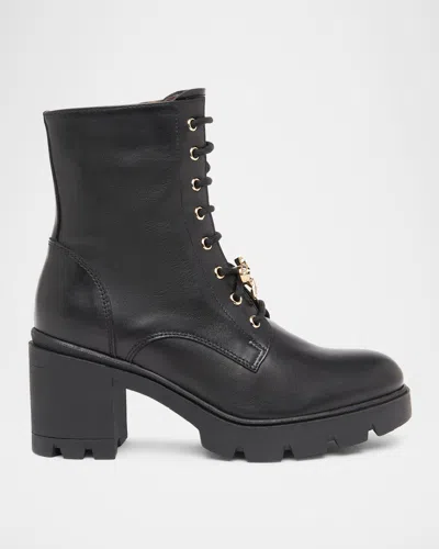 Gems Leather Bow Heeled Combat Booties In Black