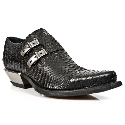 Pre-owned Newrock 7934-s2 Mens Embossed Python Black Leather Shoes Buckle Steel Heel Boot
