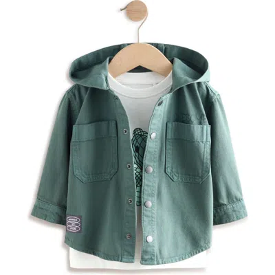 Kids' Hooded Cotton Shacket & Graphic T-shirt Set In Green