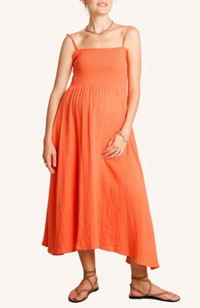 Smocked Cotton Gauzy Midi Maternity Dress In Orange