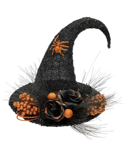 16" Tinsel Witch's Hat With Glittered Roses Halloween Decoration In Black