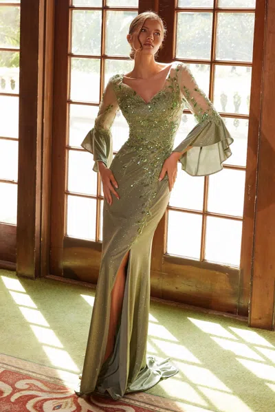 R1717 Sequin Applique Long Slit Formal Prom Dress In Green