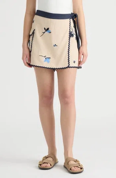 Floral Embroidered Rickrack Trim Wrap Skort In Brown