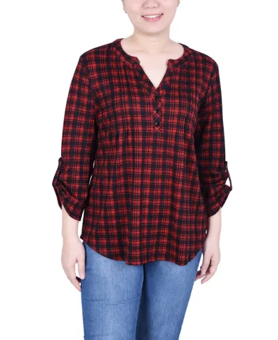 Petite Size 3/4 Roll Sleeve Top In Red Black Plaid