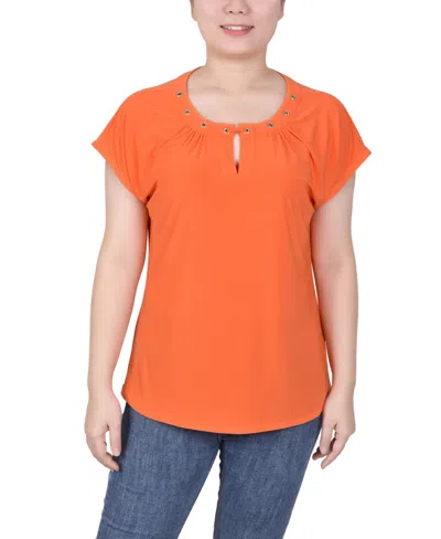 Petite Grommet Neck Knit Short Extended Sleeve Top In Flame