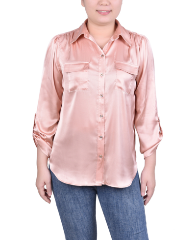 Petite Tabbed Long Sleeve Satin Blouse In Champagne