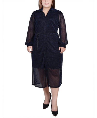 Plus Size Long Sleeve Plisse Mesh Dress With Belt In Navy