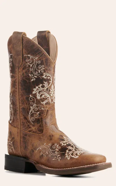 Youth Burnt Tan With Cream Embroidery Wide Square Toe Cowboy Boots In Brown