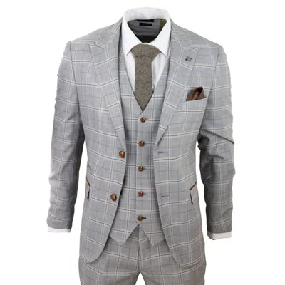 Mens Grey Suit 3 Piece Check Vintage Retro Smart Wedding Classic Tailored Fit