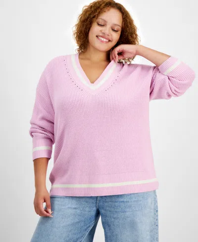 Trendy Plus Size V-neck Tipped Sweater, Created For Macy's In Pink Lilac