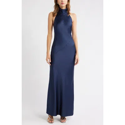 Sleeveless Satin Halter Dress In Blue