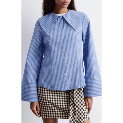 Stripe Oversize Collar Stretch Cotton Blend Button-up Shirt In Blue