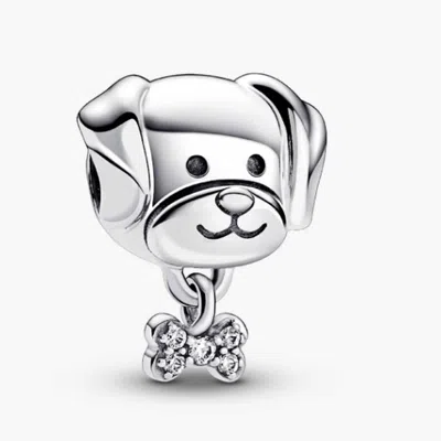 Dog Sterling Silver Charm With Clear Cubic Zirconia In Metallic