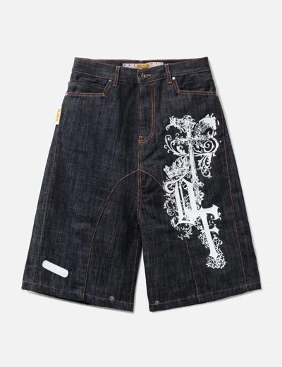 Dark Blue Printed Cotton Denim Biker Shorts In Black