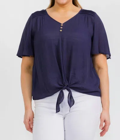 Pleat Short Sleeve Front Tie Blouse Plus Size In Navy In Blue