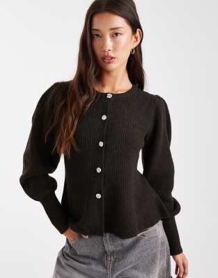 Cinched Waist Balloon Sleeve Cardigan With Hammered Buttons In Brown