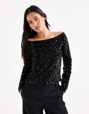 Velvet And Sequin Off Shoulder Top In Black