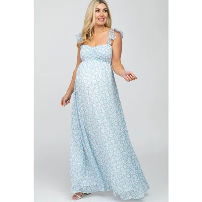 Floral Chiffon Sweetheart Neck Off Shoulder Maxi Dress In Blue