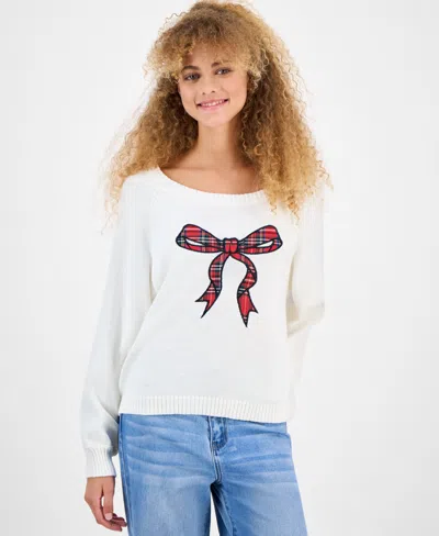 Juniors' Cotton Bow-applique Boat-neck Sweater In White