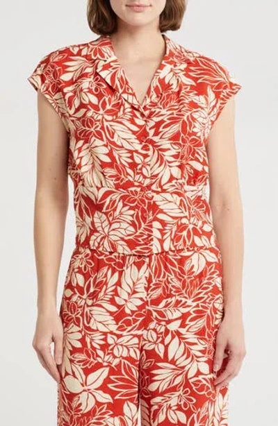 Short Sleeve Faux Wrap Textured Satin Top In Brown