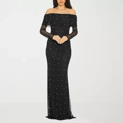 Off The Shoulder Womens Pearl Trim Long Sleeve Evening Gown In Black