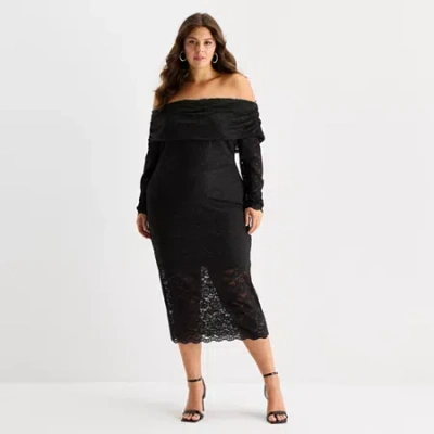Off The Shoulder Womens Plus Long Sleeve Midi Sheath Dress In Black