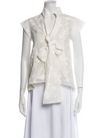 Pre-owned Tie Neck Short Sleeve Button-up Top In White
