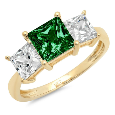 Pre-owned 3 Princess 3stone Simulated Emerald Classic Bridal Ring Solid 14k Yellow Gold In D