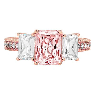 Pre-owned 3.61 Emerald Cut Simulated 3 Stone Pink Promise Wedding Ring 14k Rose Solid Gold