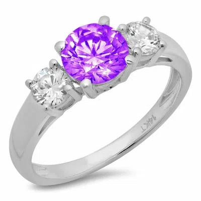 Pre-owned 1.50ct Round 3 Stone Real Amethyst Classic Bridal Statement Ring 14k White Gold In D