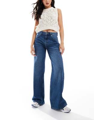 Mid Rise Wide Leg Jeans With Crossover Waist In Blue