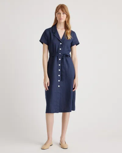 Women's 100% European Linen Button Front Dress In Deep Navy