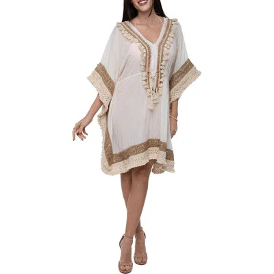 Ranees Tassel Trim Cotton Dobby Caftan In White