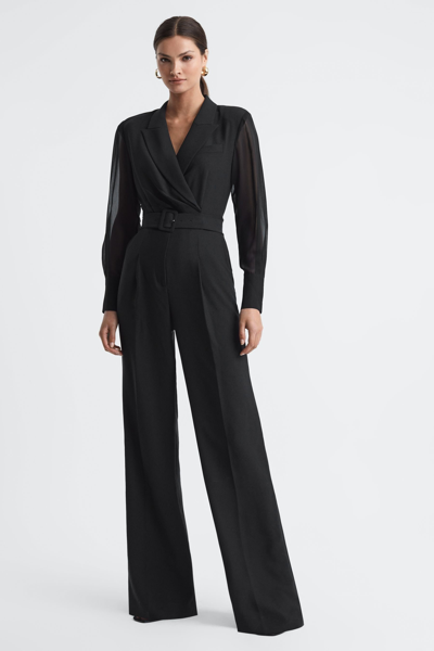 Black Petite Sheer Belted Double Breasted Jumpsuit