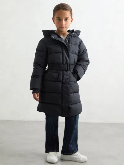 Kids' Navy Longline Hooded Puffer Coat In Black