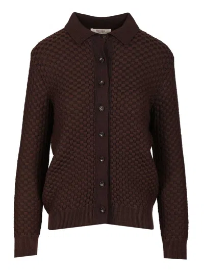 Damier Wool And Silk Jacquard Button Down Cardi With Shirt Collar Knitwear Brown