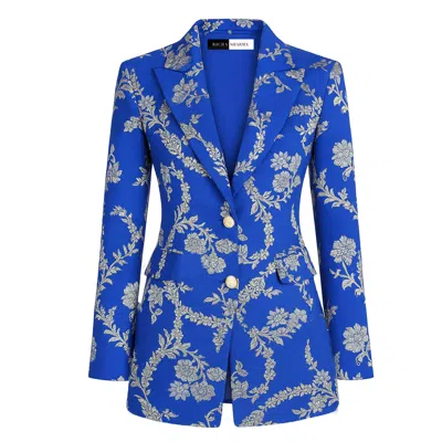 Blue / Silver Luxury Royal Blue Brocade Women's Blazer Set With Silver Embroidery