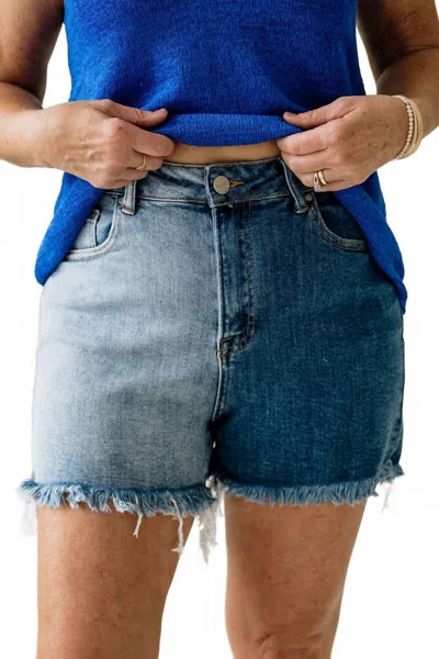 High Rise Contrast Wash Button Fly Shorts In Medium Blue/dark Blue In Pink