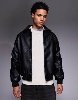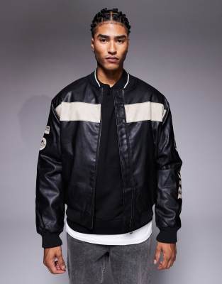 Marbled Effect Faux Leather Varsity Jacket In Brown