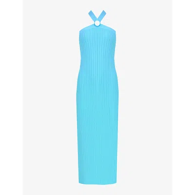 Circular-buckle Halter-neck Knitted Maxi Dress In Blue